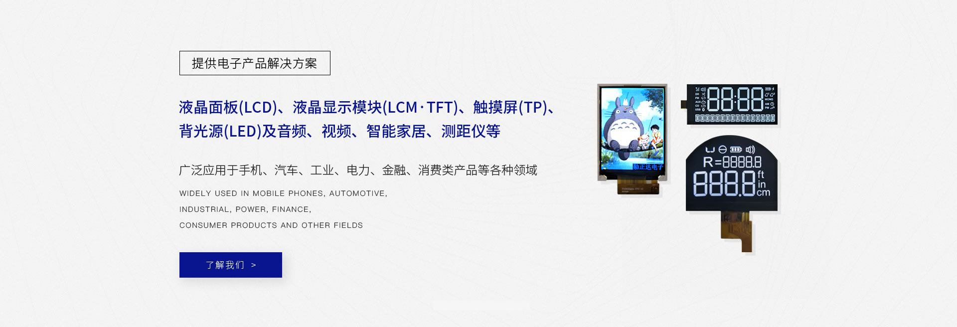 專業(yè)設(shè)計、生產(chǎn)液晶面板(LCD)、液晶顯示模塊(LCM·TFT)、觸摸屏(TP)、背光源(LED)及音頻、視頻、智能家居、測距儀等